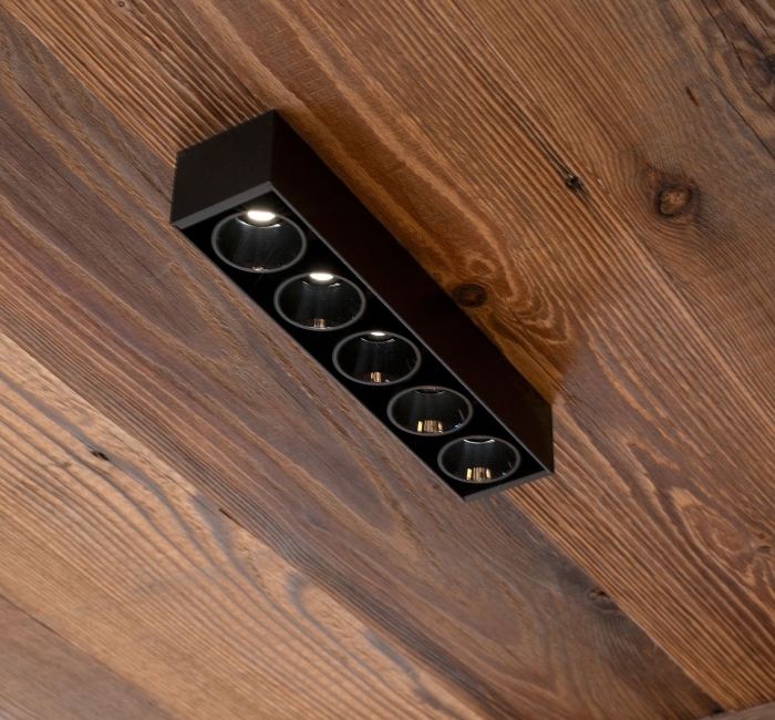 Arkoslight’s Black Foster stands out for its sleek design, refined elegance, and exceptional visual comfort. Thanks to its remarkably precise optics, it integrates with absolute discretion: when in operation, the light source blends seamlessly into the ceiling, almost invisible to the eye. This subtle design creates a perfectly controlled lighting effect — both elegant and imperceptible. Installed on the surface of an old wooden ceiling, its linear and contemporary aesthetic introduces a subtle contrast that brings a touch of modernity while preserving the charm of the space.