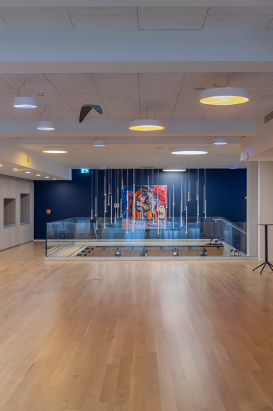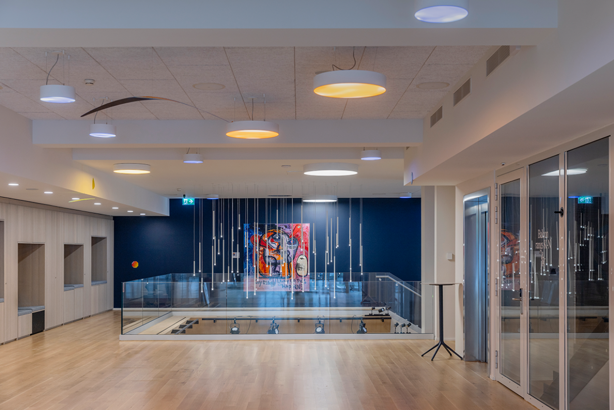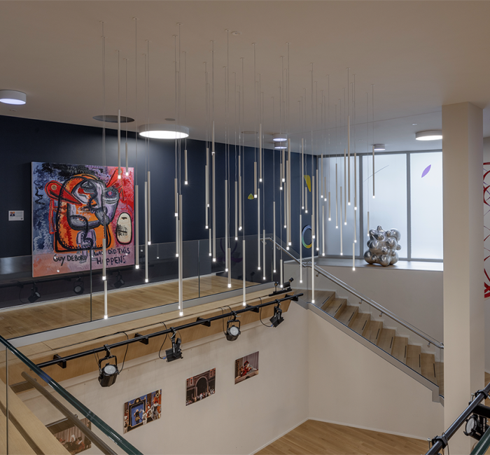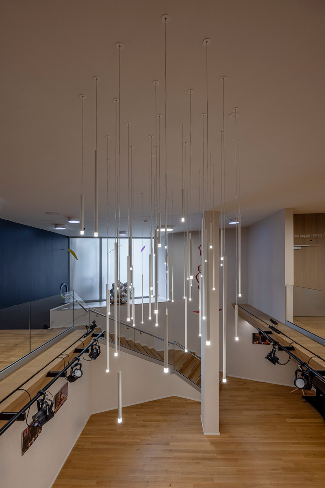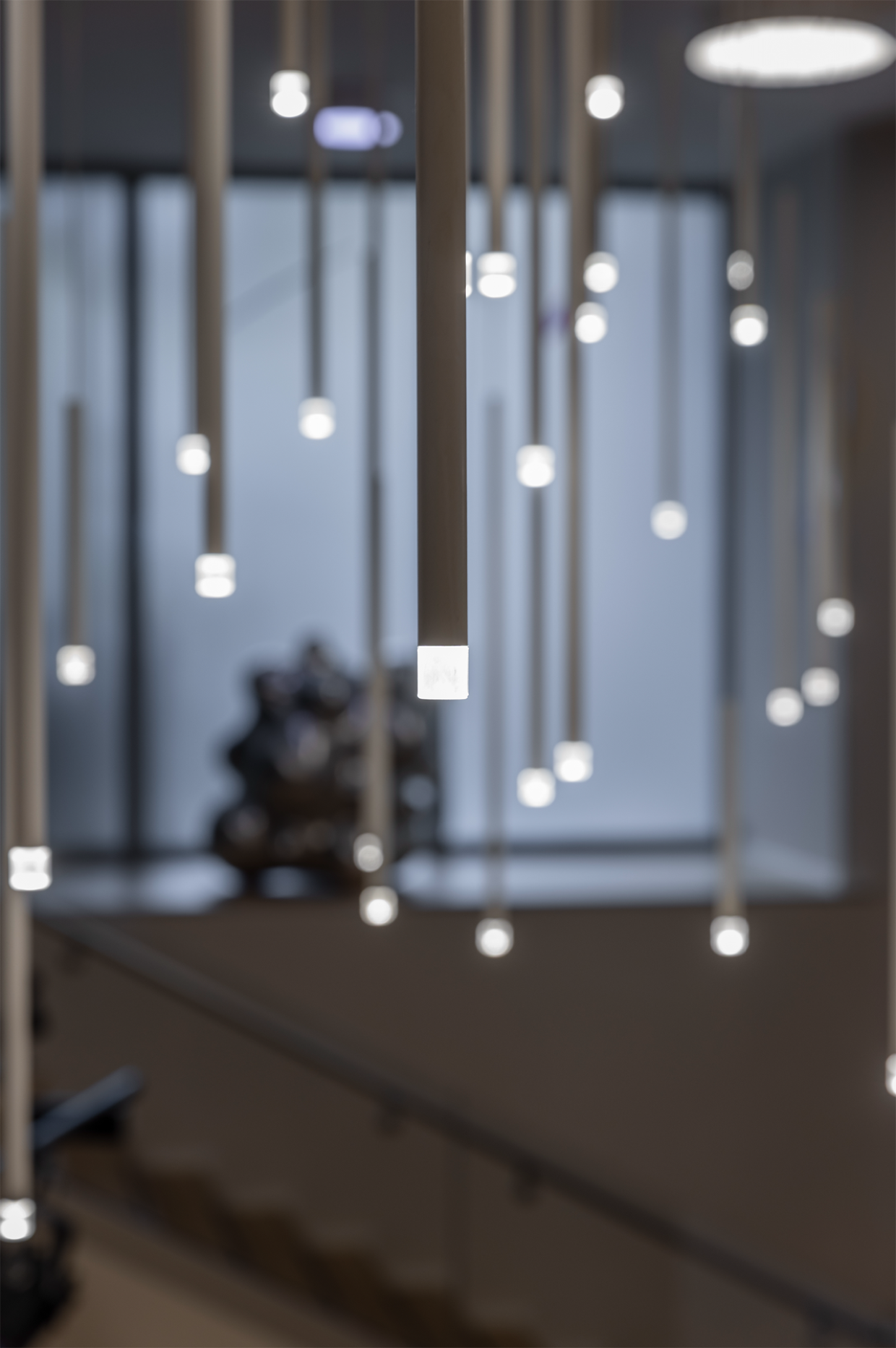 La suspension A-Tube Nano de Lodes a été choisie pour l’éclairage de la cage d’escalier afin d’apporter une présence lumineuse à la fois discrète et élégante. Son design minimaliste et élancé s’intègre harmonieusement à l’architecture verticale de l’espace, tout en soulignant les volumes et les lignes de circulation.